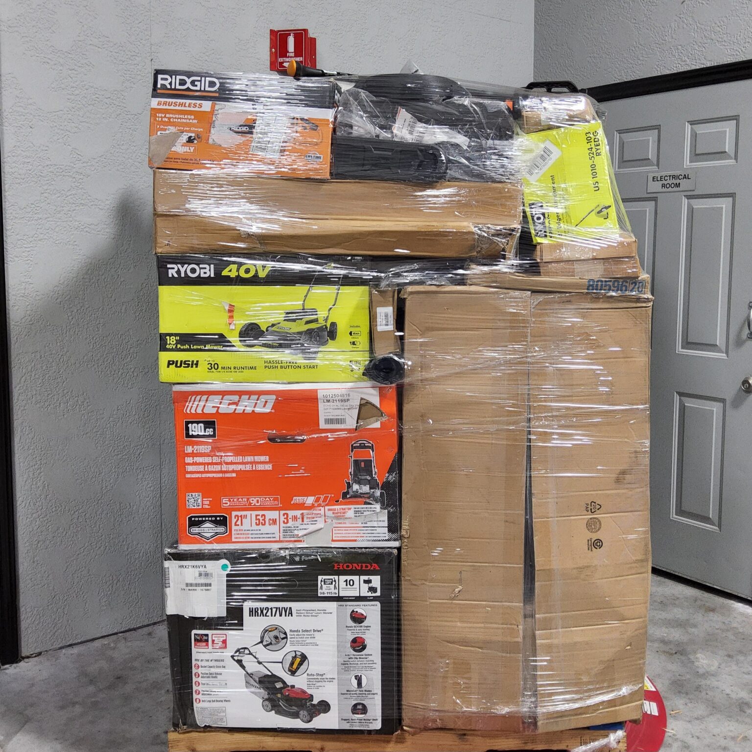 Each pallet features a varied selection of gas and electric lawn mowers from trusted brands, along with a curated assortment of outdoor maintenance tools that may include: